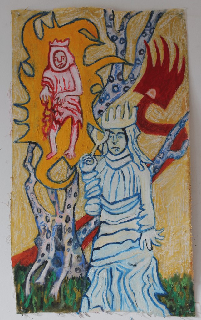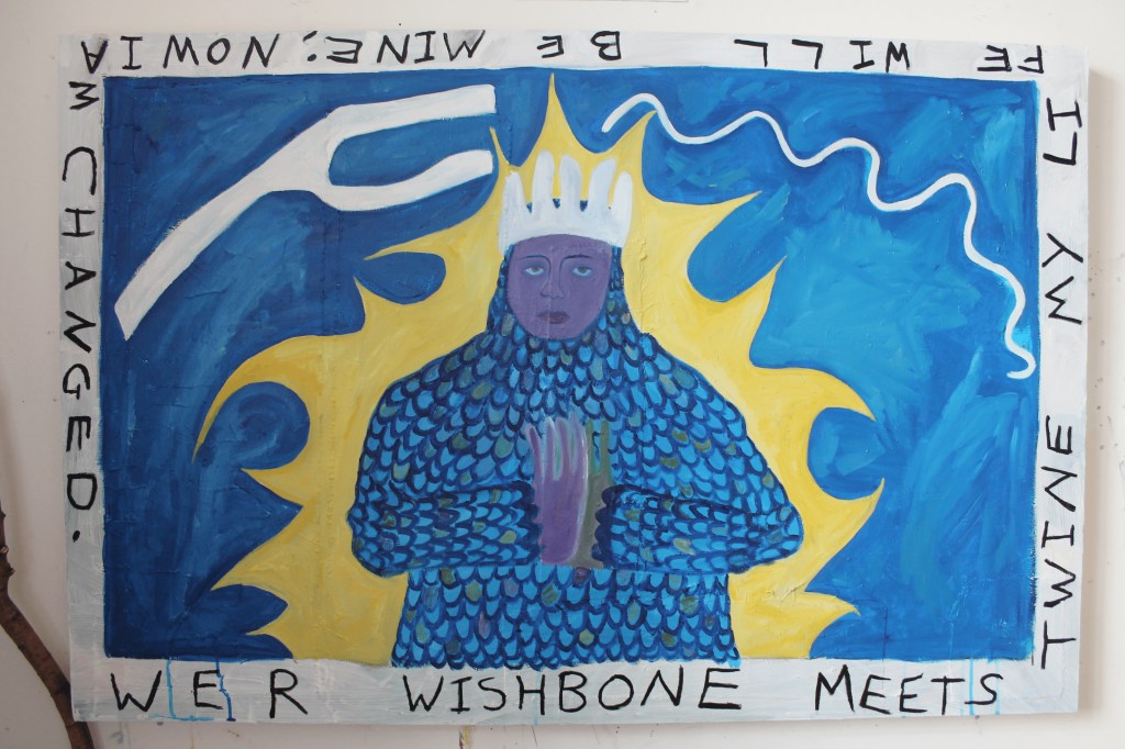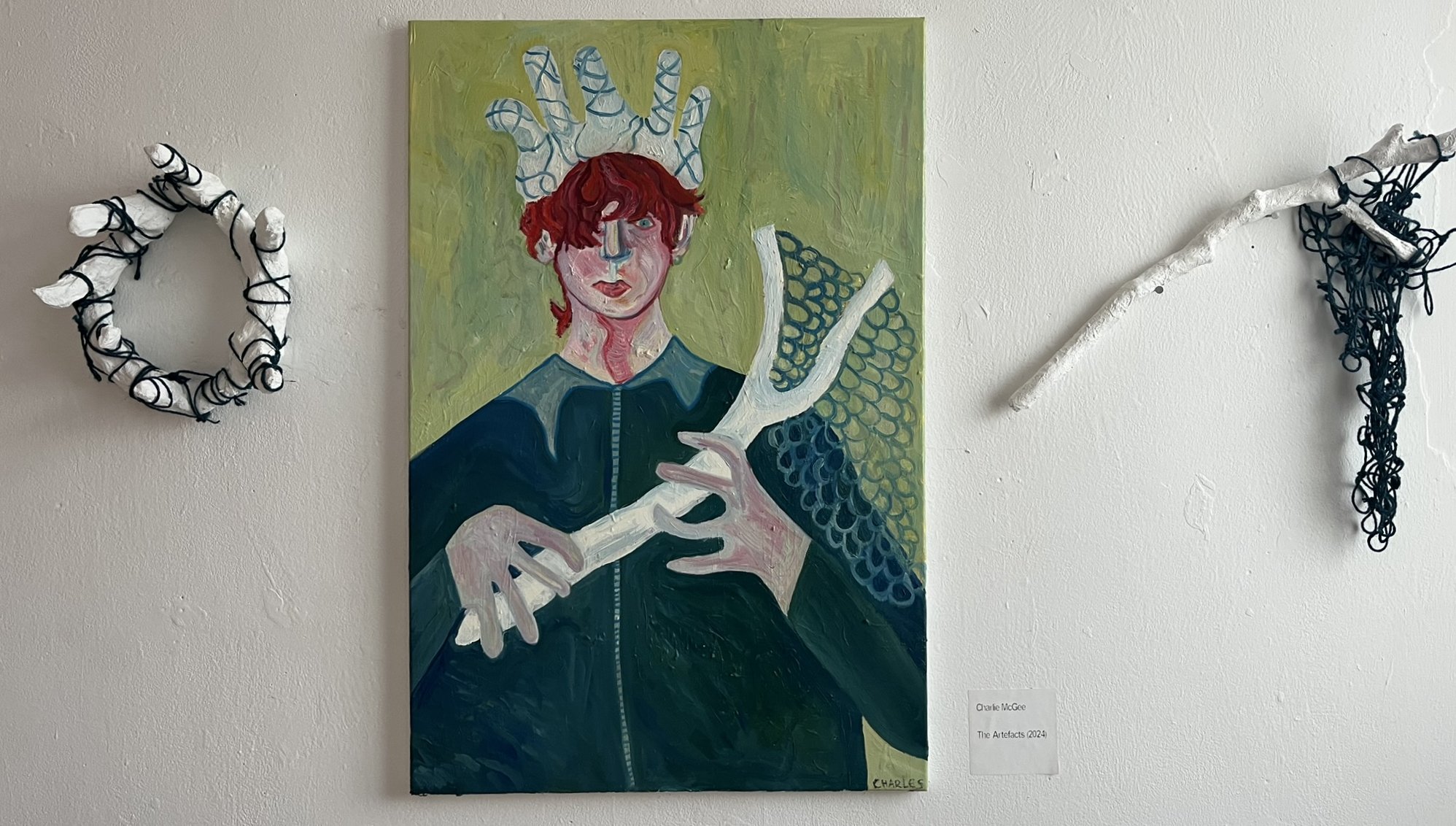 my current practice is a narrative project, envisioning a religion based on the changing of genders; the transformation of bodies. we exist in a time where we can modify our biologies and our realities.. there is something already almost god-like about that. i wanted to take that further with this project. i am interested in repetitive imagery, something that you see in religious art work. i wanted to narrow down a few key symbols that would represent my trans religion hence the crown, the net, the angelic figure.